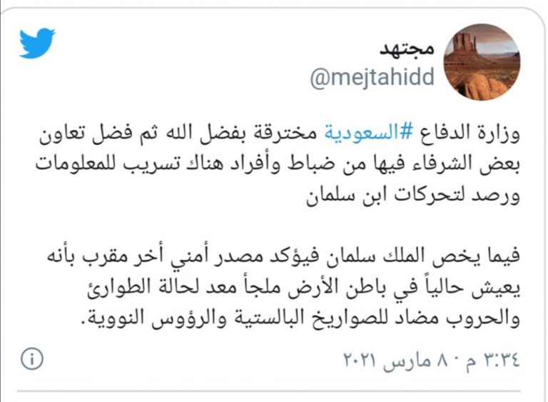 وقال “مجتهد” في تغريدة له على تويتر ” وزارة الدفاع السعودية تم اختراقها بفضل الله وتعاون الشرفاء فيها من ضباط وأفراد”, حسب قوله.